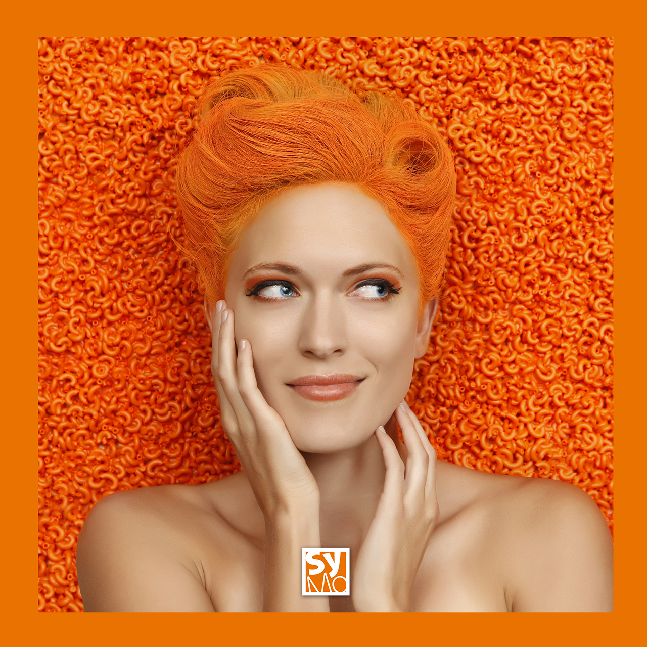 There were talks about using sharp cheddar cheese for Orange, but we had no idea how to implement cheese into our image. Obviously, using real cheese would be costly and very odorous. After much deliberation, Jess came up with a brilliant way to incorporate macaroni and cheese into the background, using paint and various adhesives. I think you'll agree, that it came out looking very real.
