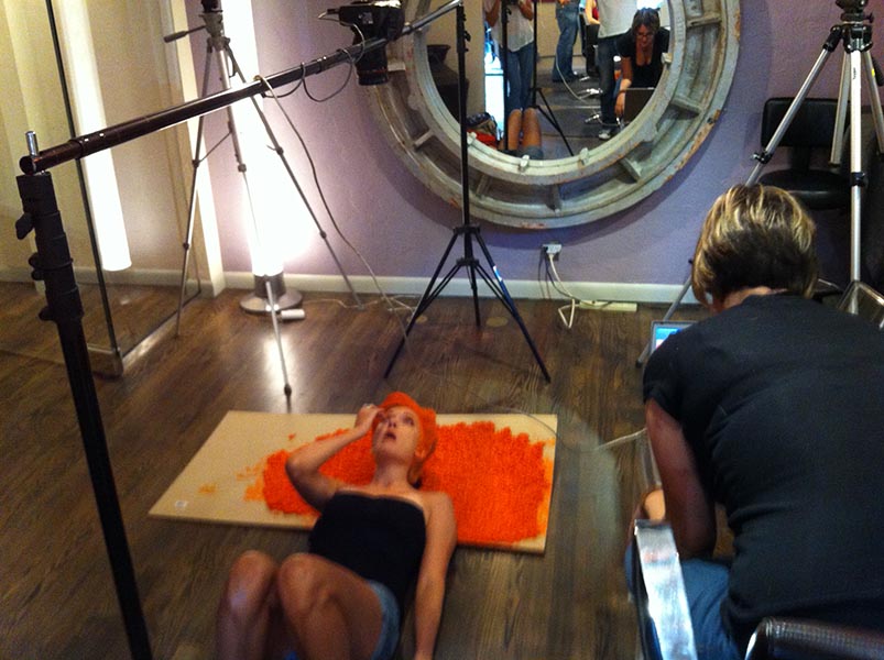 After the background piece was assembled(it looks so real and cheesy!) we gathered at XOXO to get the hair styled and colored. The hair is styled to mimic tube pasta, like rigatoni. A wonderful idea brought to us by Rebekah, one of our all time favorite stylists. Many of our popular photographs were styled by Rebekah, and we had no doubts that she would again do an amazing job.